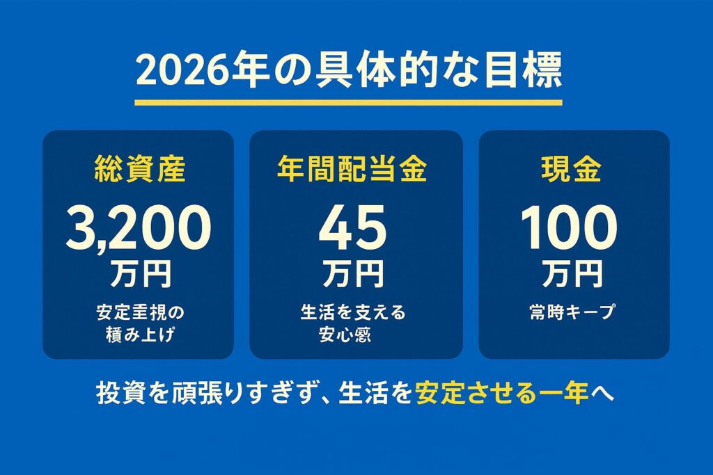 2026年は、仕事や生活環境が大きく変わる節目の年になります。そのため、資産を一気に増やすことよりも、安定して使い続けられる状態を作ることを重視します。現時点で設定している、2026年の具体的な目標は以下の3つです。